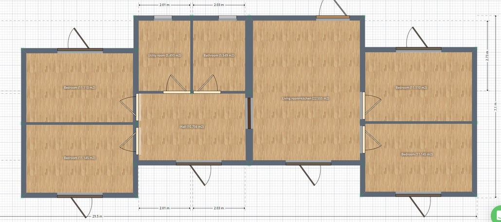 - La surface intérieure est de 103 m2 envrion Brut composé de trois espaces : deux espaces chambre de 26,5m2 chacune et une partie pièce de vie de 50 m2 environ
