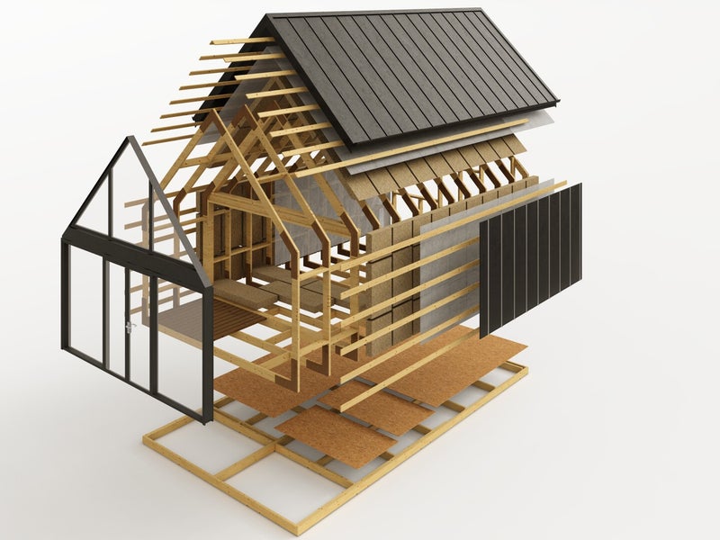 - Ossature bois préfabriqué complète sur mesure et numérotés pour facilité l'assemblage Le sol, les murs et la toiture sont isolés (jusqu’à 200 mm d’isolant de base, options +50 mm ou +100 mm)en option possible