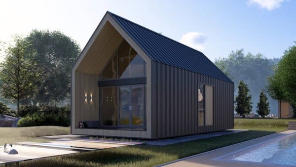 Compact et élégant, cette maison type Grange moderne de 35 m² de surface intérieure que vous pouvez construire sur pilotis par exemple et même habiller de bois à la place du bardage bac acier métal fournis dans le KIT sur les murs extérieurs, est idéal pour en faire un hébergement insolite / locatif ou une résidence secondaire, avec sa petite terrasse en bois intégrée dans votre structure.