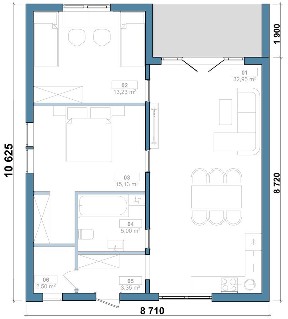 - Dimensions de la construction : 8,72 m x 11,86 m