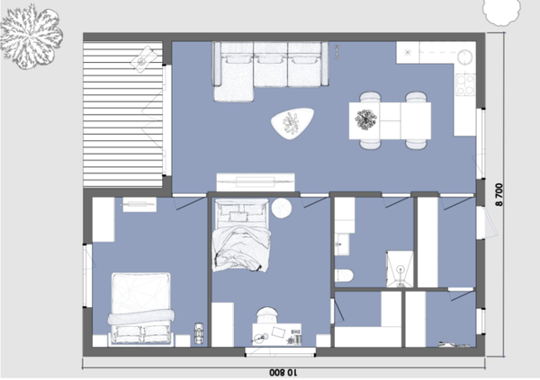 Aménagement Familial Complet : Contrairement aux studios de jardin, la Lagom est une véritable maison offrant 2 chambres, un grand salon-cuisine traversant, un hall d'entrée et une salle de bain spacieuse.