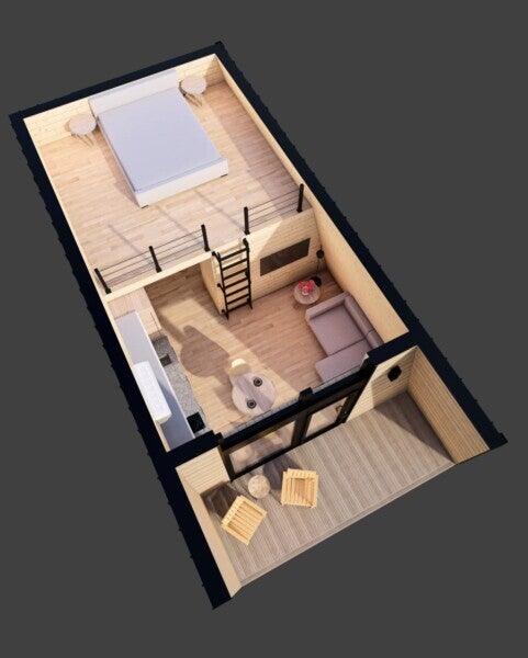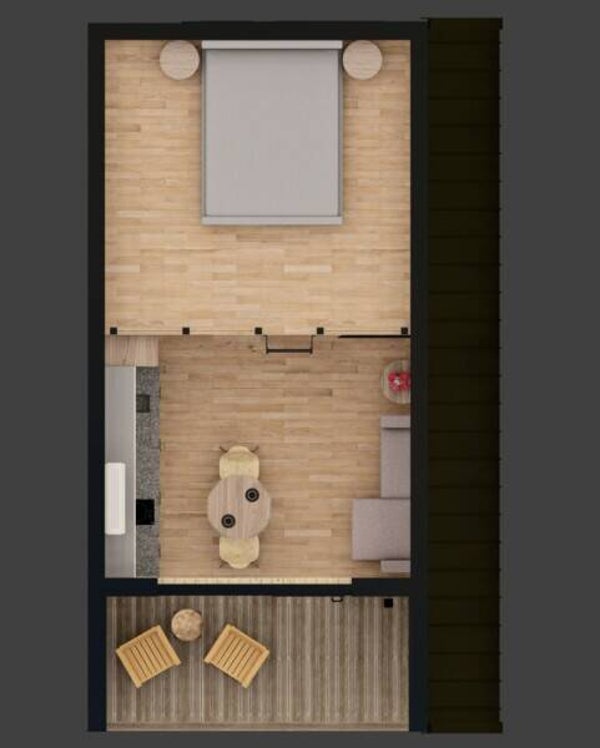Version 42 m² Brut (Optimisée) : Une solution intelligente offrant une chambre douillette et une pièce de vie fonctionnelle. Elle est idéale pour un couple, un studio d'invités ou pour rester dans le cadre d'une Déclaration Préalable (DP) simplifiée avec ces 28 m2 net au RDC et une mezzanine.
