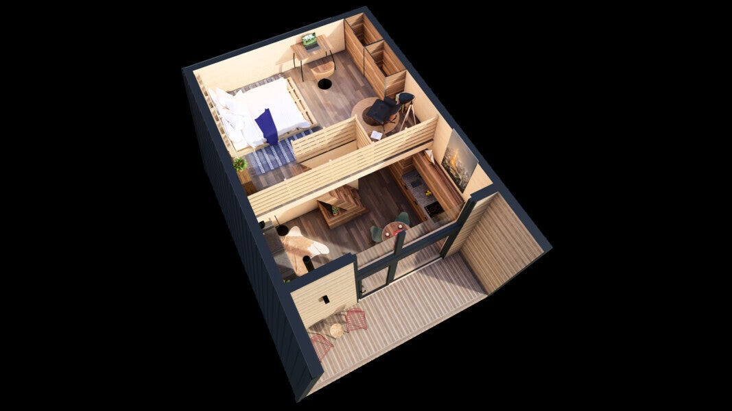 Le modèle Freja 59 est l'évolution spacieuse de notre concept iconique. Avec son toit asymétrique et sa façade monumentale entièrement vitrée, il ne se contente pas d'être une cabane design : c'est une véritable maison de vie, pensée pour maximiser la lumière et la fluidité entre l'intérieur et l'extérieur.