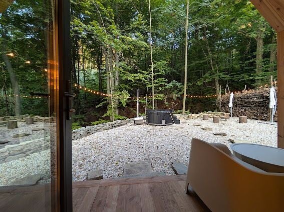 Mezzanine Panoramique : Un espace en hauteur baigné de lumière, dédié au repos ou au bureau, surplombant la pièce de vie et offrant une vue imprenable sur la nature grâce à la façade entièrement vitrée.